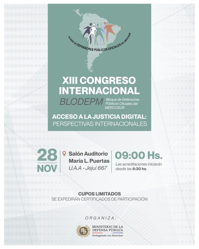 Este viernes 28 de noviembre del año 2025 tendrá lugar el XIII Congreso Internacional del Bloque de Defensores Públicos del Mercosur cuyo Lema es «Acceso a la Justicia Digital: Perspectivas Internacionales»